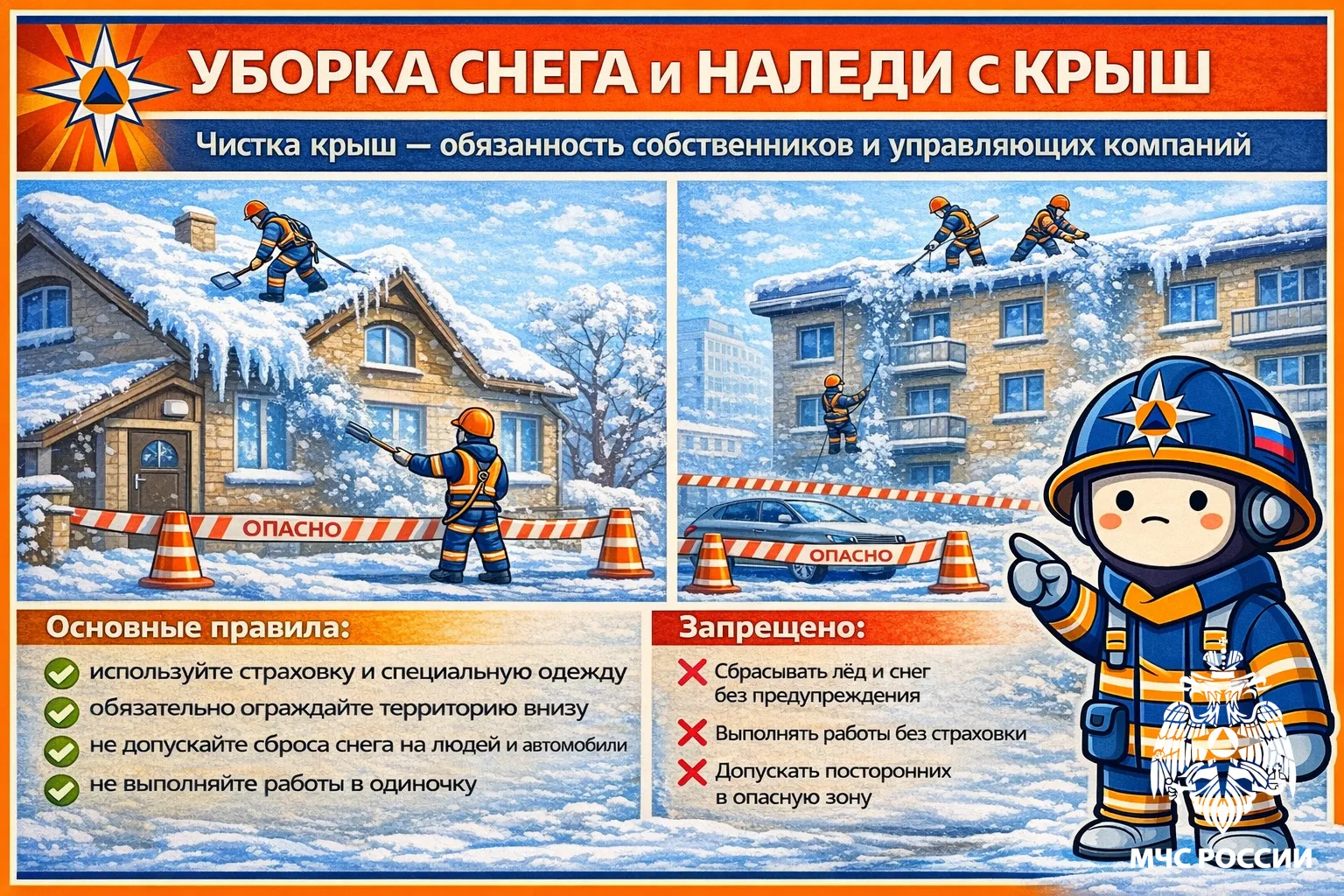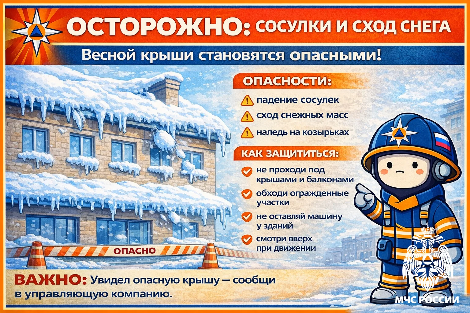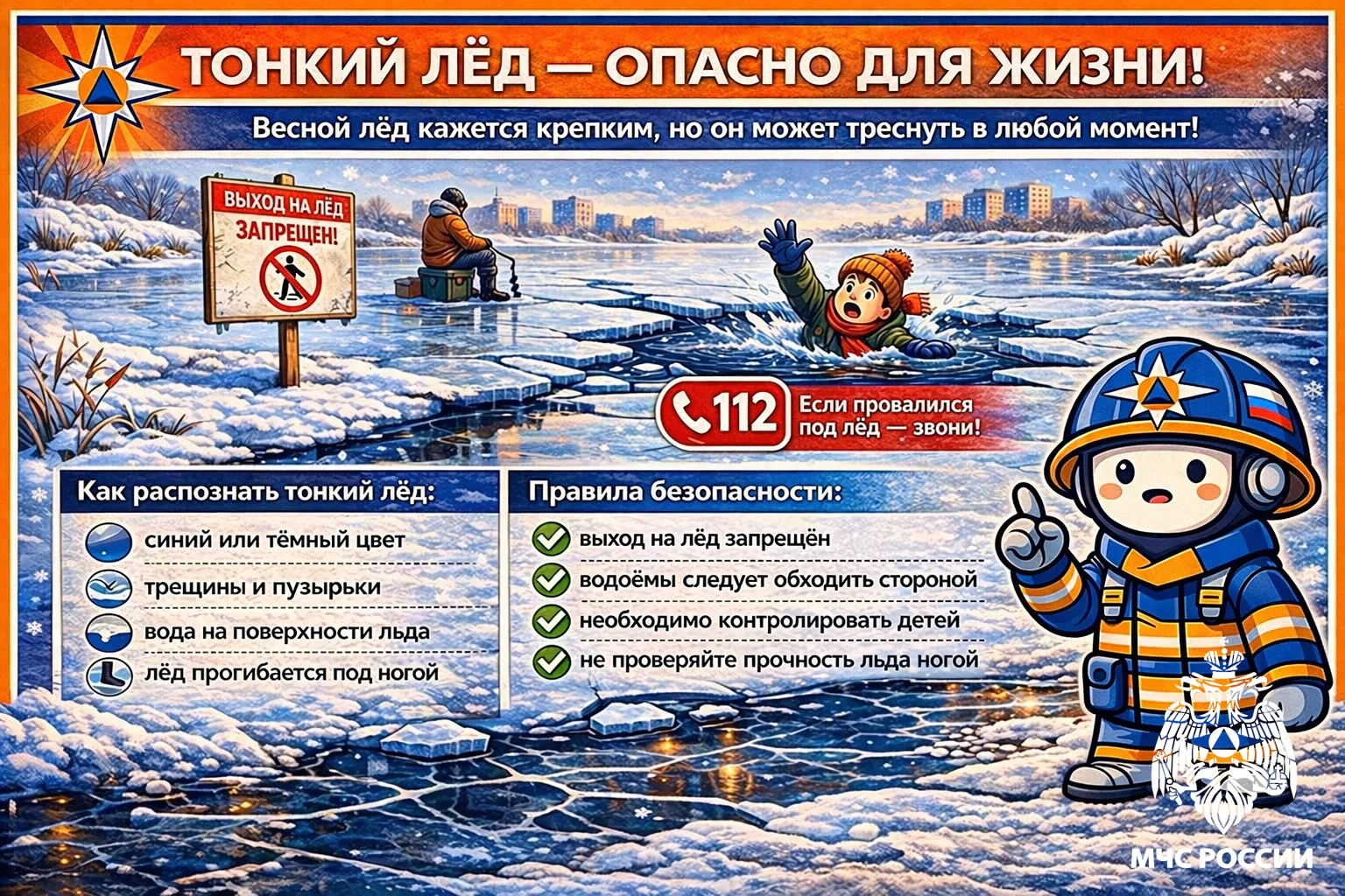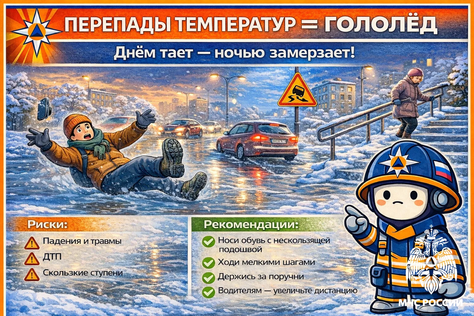🔹 Перепады температур, сход снега с крыш, гололёд и тонкий лёд на водоёмах — всё это может привести к травмам и чрезвычайным ситуациям.