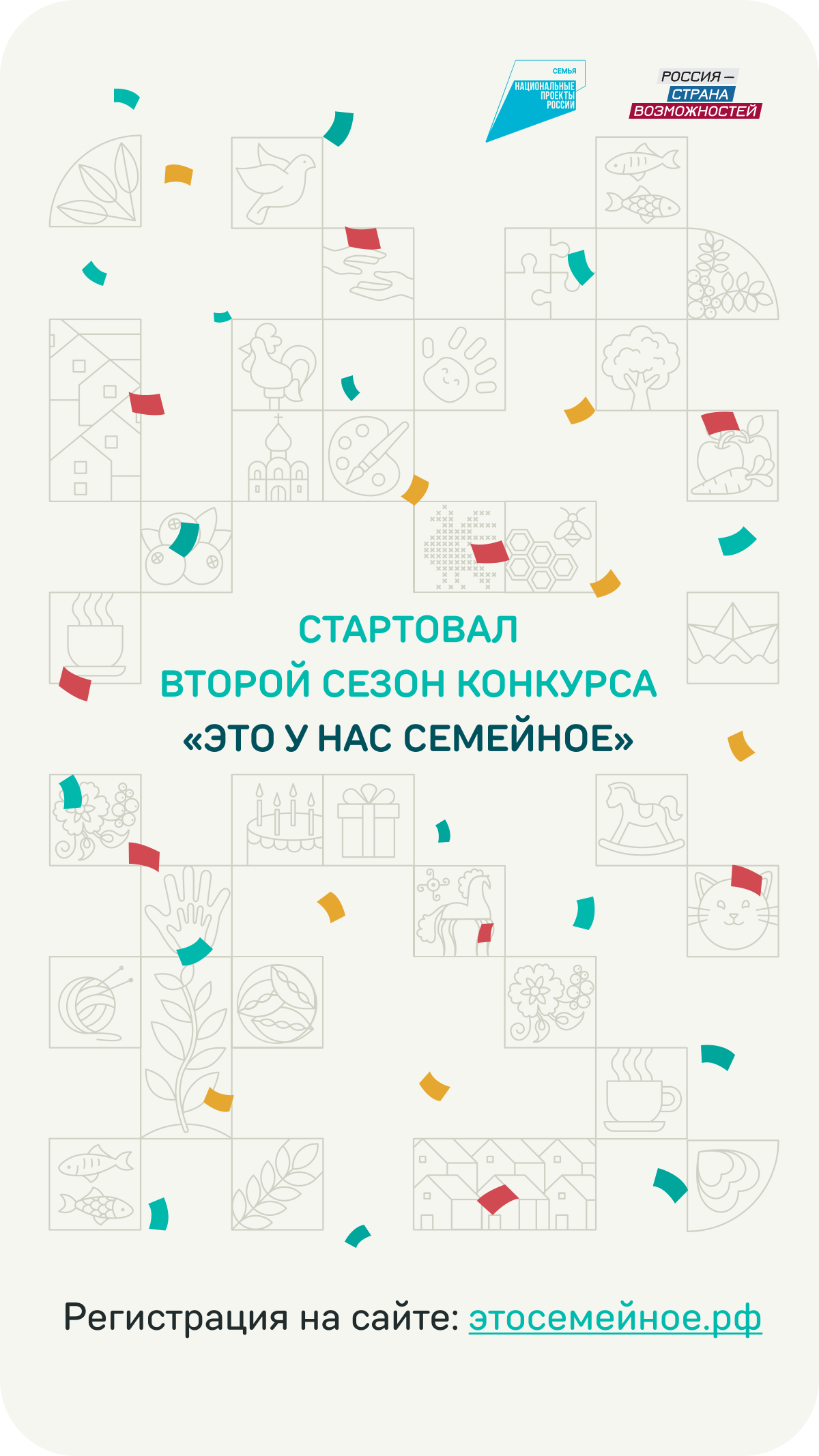 Продолжается приём заявок на конкурс "Это у нас семейное", который является частью национального проекта "Семья". Концепция Конкурса заключается в семейных ценностях и традициях, которые передаются из поколение в поколение и объединяют семьи, праздники и обычаи знакомые нам с детства, достижения науки, культуры, спорта, которыми гордится вся страна.